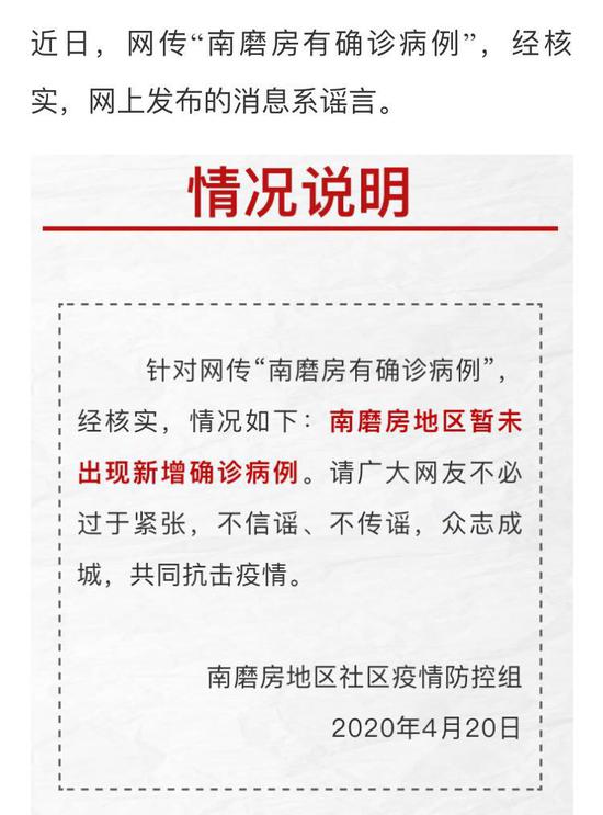 北京朝陽區官方平臺發布消息,近日,網傳“南磨房有確診病例”,經核實,網上發布的消息系謠言。