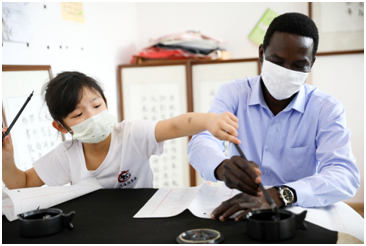 在廣州增城居住的南非人Alex跟中國小朋友學書法