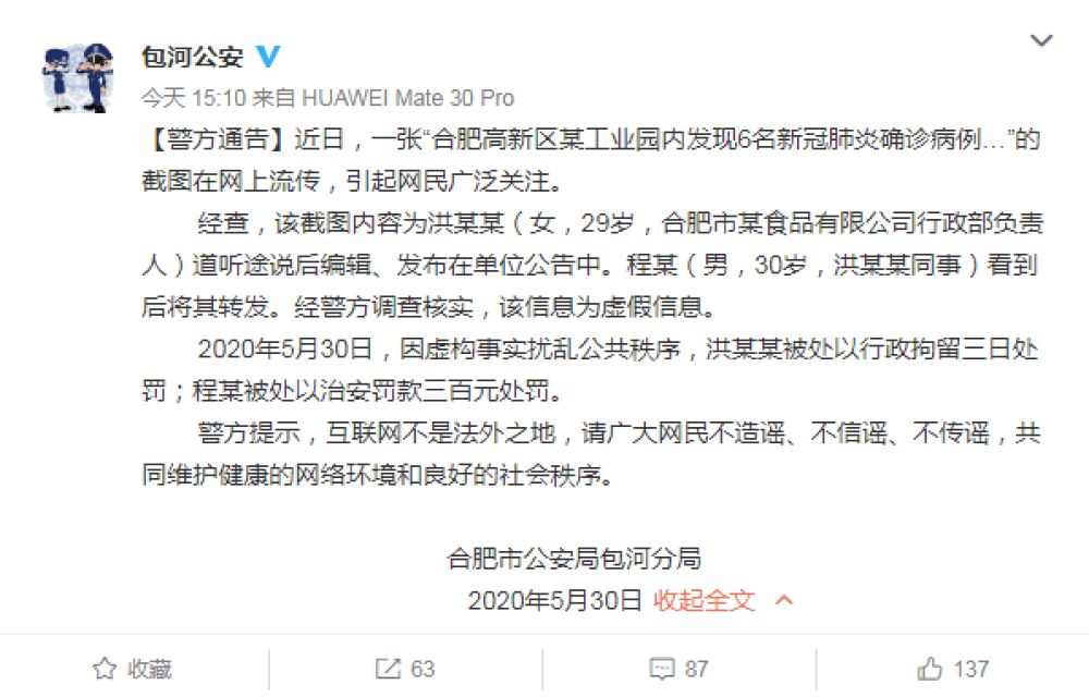 經查,該截圖內容為洪某某(女,29歲,合肥市某食品有限公司行政部負責人)道聽途說后編輯、發布在單位公告中。程某(男,30歲,洪某某同事)看到后將其轉發。經警方調查核實,該信息為虛假信息。