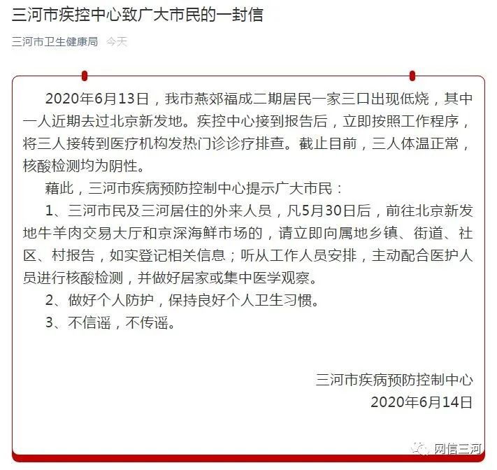 @三河市衛生健康局:三人體溫正常,核酸檢測均為陰性!