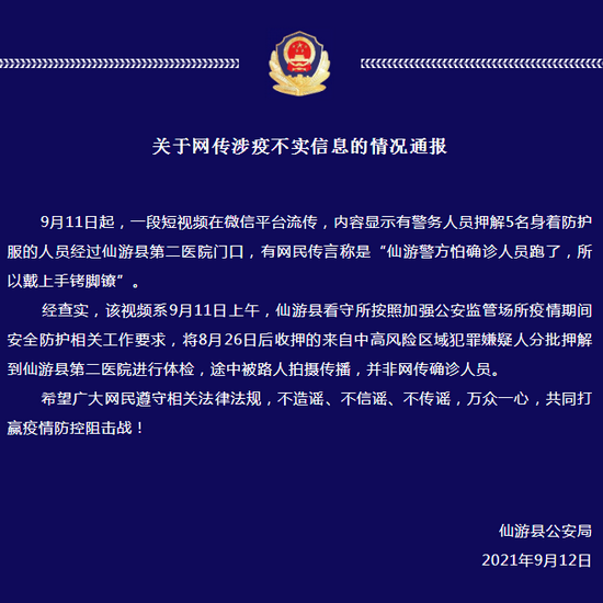 經查實,該視頻系9月11日上午,仙游縣看守所按照加強公安監管場所疫情期間安全防護相關工作要求,將8月26日后收押的來自中高風險區域犯罪嫌疑人分批押解到仙游縣第二醫院進行體檢,途中被路人拍攝傳播,并非網傳確診人員。