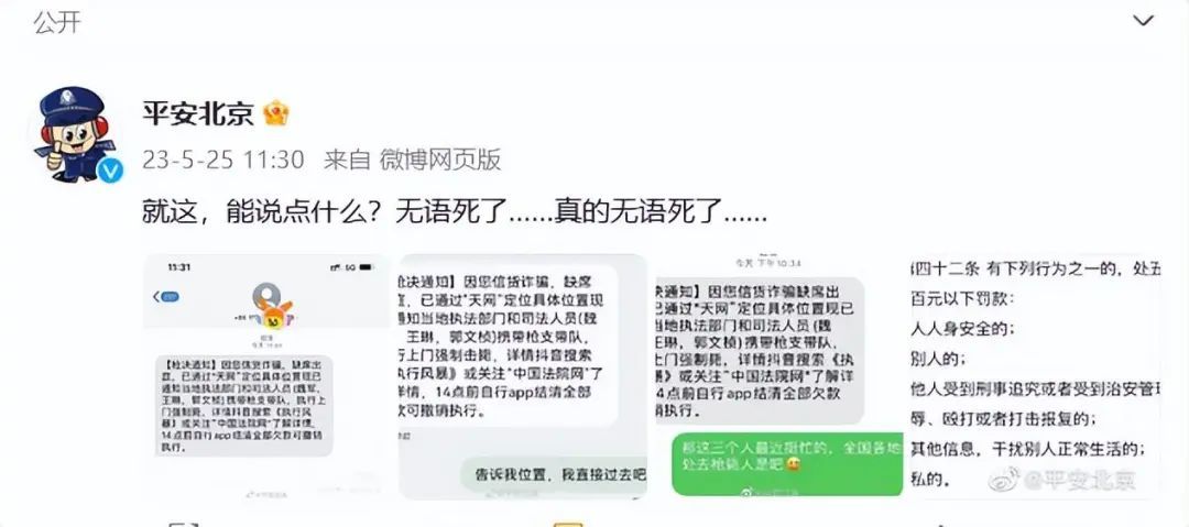“因您信貨詐騙,缺席出庭,已通過“天網”定位具體位置現已通知當地執法部門和司法人員(魏軍,王琳,郭文禎)攜帶槍支帶隊,執行上門強制槍斃,詳情抖音搜索《執行風暴》或關注“中國法院網’”了解詳情,14點前自行app結清全部欠款可撤銷執行?!?/p>