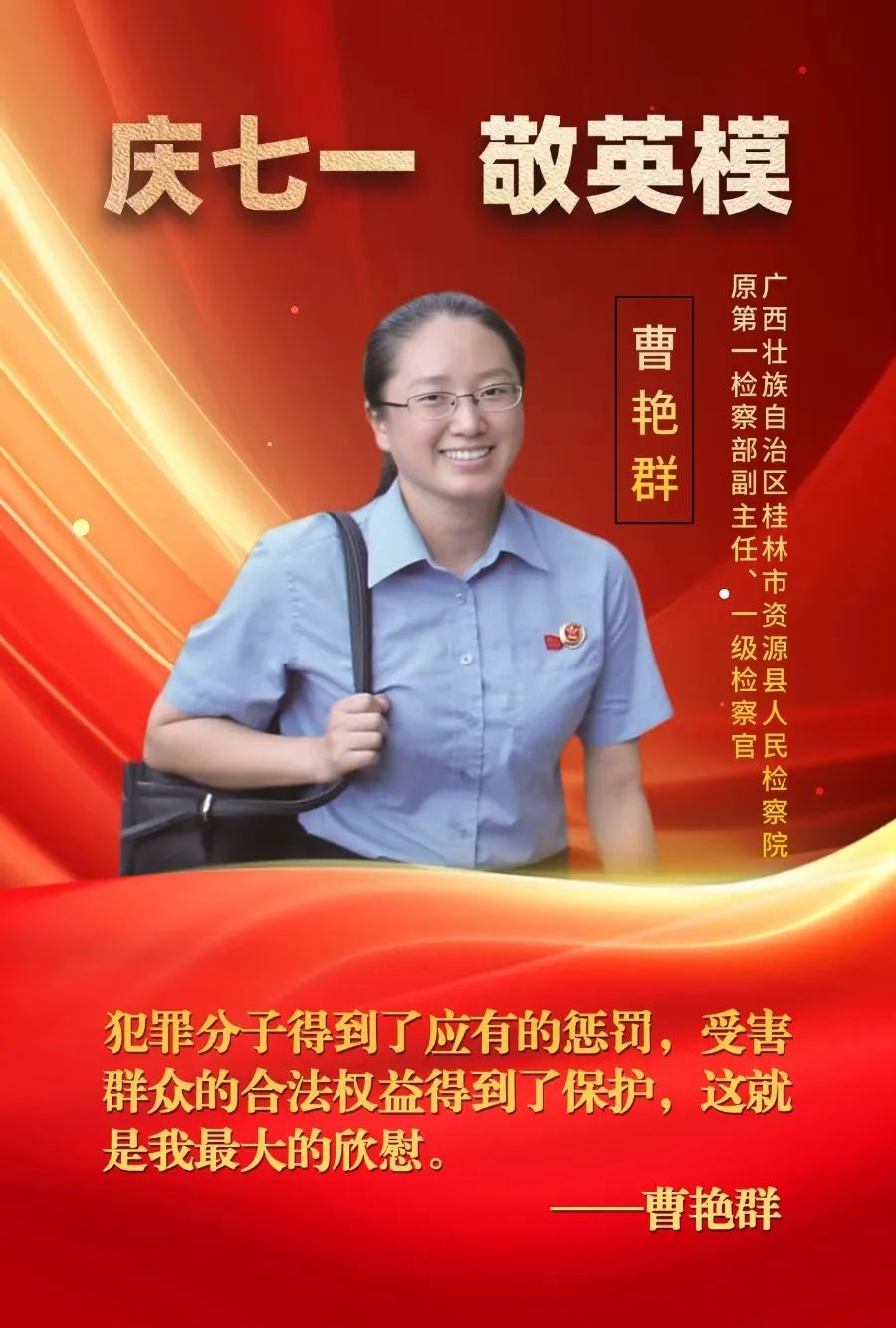 曹艷群,原廣西壯族自治區(qū)桂林市資源縣人民檢察院檢委會(huì)委員、第一檢察部副主任、一級(jí)檢察官。扎根廣西桂北山區(qū)檢察辦案一線,所辦案件多次被評(píng)為自治區(qū)檢察機(jī)關(guān)精品案件。因公殉職后,被追授為“全國模范檢察官”“廣西壯族自治區(qū)優(yōu)秀共產(chǎn)黨員”“八桂楷模”。