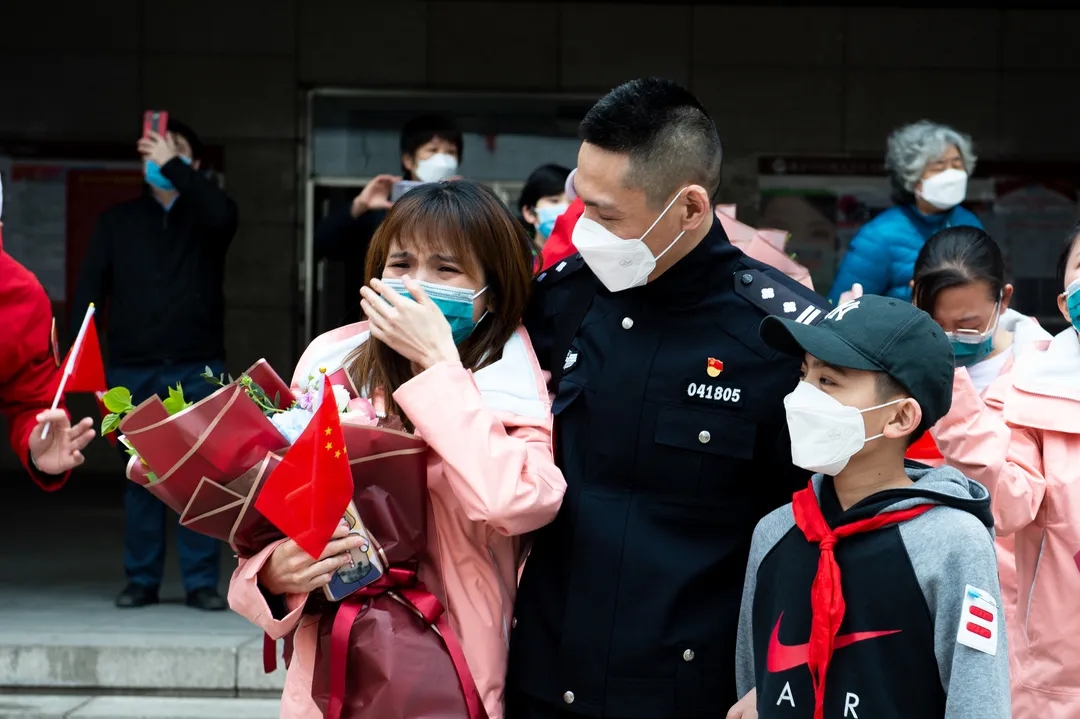 在另一個視頻中,一周前,北京東方醫院,民警劉尚輝也和援鄂的妻子緊緊相擁。