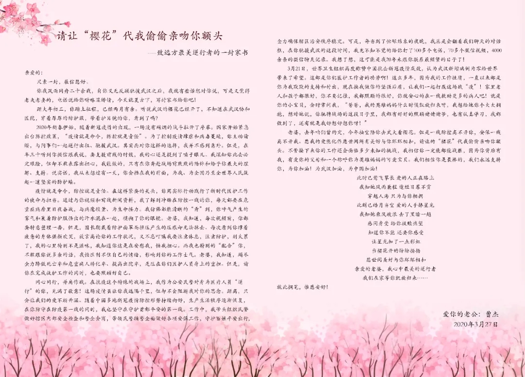 3月中旬,曹杰就開始為妻子準備歸來的禮物。他親自收集并參與設計,把妻子從出發去武漢到回來的點點滴滴制作成相冊,每張照片都是精心挑選,每張照片都有著深深的含義和愛意:“鮮花會枯萎,但是這個相冊十年后翻看,還會像今天看一樣,記憶猶新。”