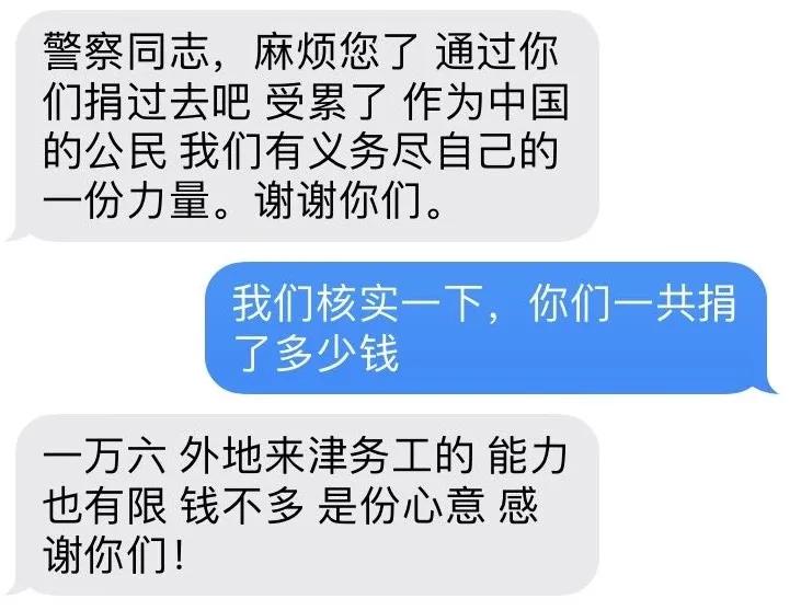 2020年2月21日早8時(shí),一名好心人來到公安東麗分局金鐘派出所留下一個(gè)袋子。值班民警打開袋子一看,里面裝有一萬(wàn)六千元現(xiàn)金及口罩兩盒。后民警通過查詢其駕駛車輛牌照號(hào)聯(lián)系到了這位好心人,其表示錢捐武漢,口罩給民警,不想透露身份。