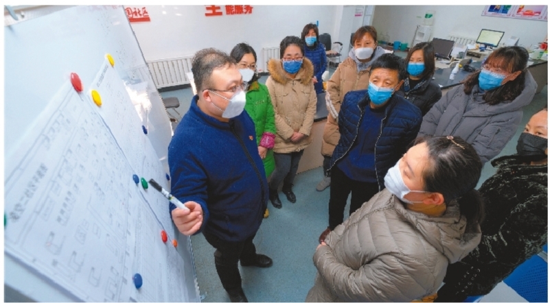 社區黨委書記張軍(左一)將社區居民樓的分布圖制成掛圖,明確每名社區工作人員的責任,進行網格化管理。