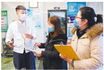 社區工作人員走訪轄區商戶,了解他們的想法和需求。