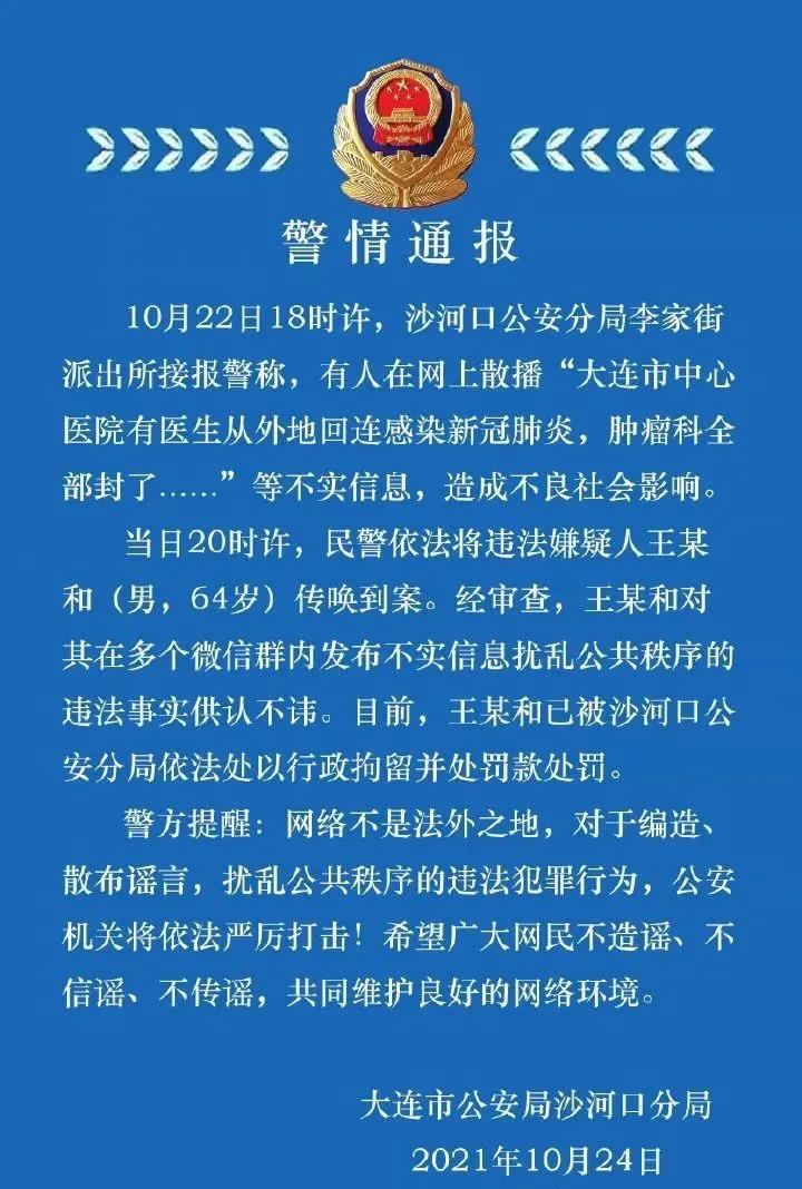 遼寧省大連市沙河口公安分局10月24日發布警情通報稱,10月22日18時許,沙河口公安分局李家街派出所接報警稱,有人在網上散播“大連市中心醫院有醫生從外地回連感染新冠肺炎,腫瘤科全部封.....”等不實信息,造成不良社會影響。