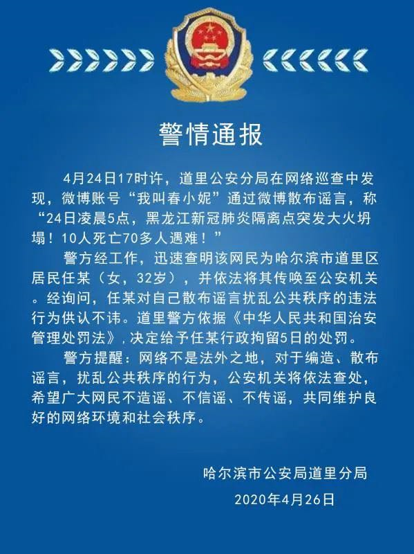 隔離點突發大火?哈爾濱警方出手,造謠者已找到