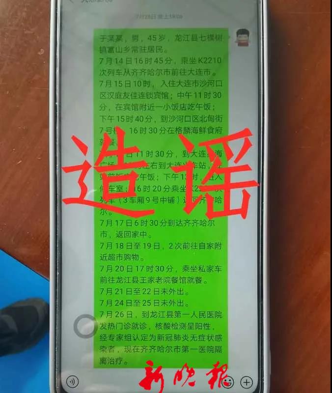 “龍江縣七棵樹鎮居民于某某從大連返回龍江縣后被確診為新冠肺炎患者”的謠言,還同時公布了虛假的“軌跡信息”。
