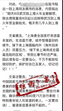 歸納一下這3則傳言,中心思想便是:4月8日起多日的武漢來滬車票已售罄,每天幾千武漢人來到上海。他們中,不乏夾雜著“無癥狀感染者”“復陽者”,這使得上海面臨著巨大的防控壓力。“上海成全國最危險地方”“飯館下不得、公共汽車坐不得”等說法,傳遞出的“焦慮”躍然紙上。而在第3版的傳言中,更傳出“國家不再承擔新增加的新(型)冠狀肺炎患者的醫療費用”之說,讓人看后緊張不已。
