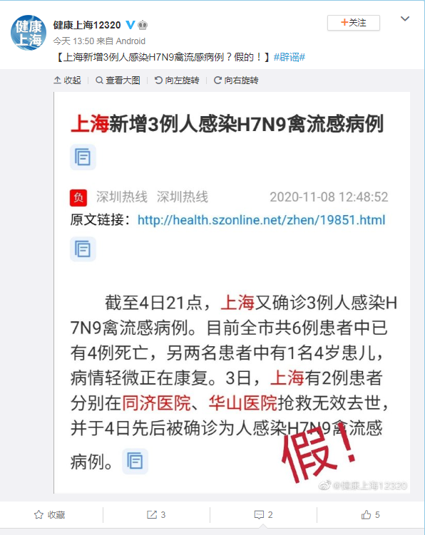據上海市衛健委官方微博消息,近日有媒體報道稱,“截至4日21點,上海又確診3例人感染H7N9禽流感病例。目前全市共6例患者中已有4例死亡,另兩名患者中有1名4歲患兒,病情輕微正在康復。”上海市衛健委表示,此為假消息。