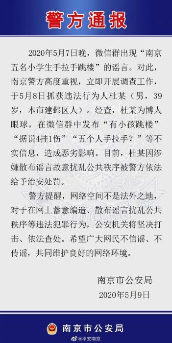 針對微信群出現“南京五名小學生手拉手跳樓”的謠言,江蘇省南京市公安局官方微博9日凌晨發布消息稱,已抓獲違法行為人杜某。經查,杜某為博人眼球發布不實信息,目前已被警方依法給予治安處罰。