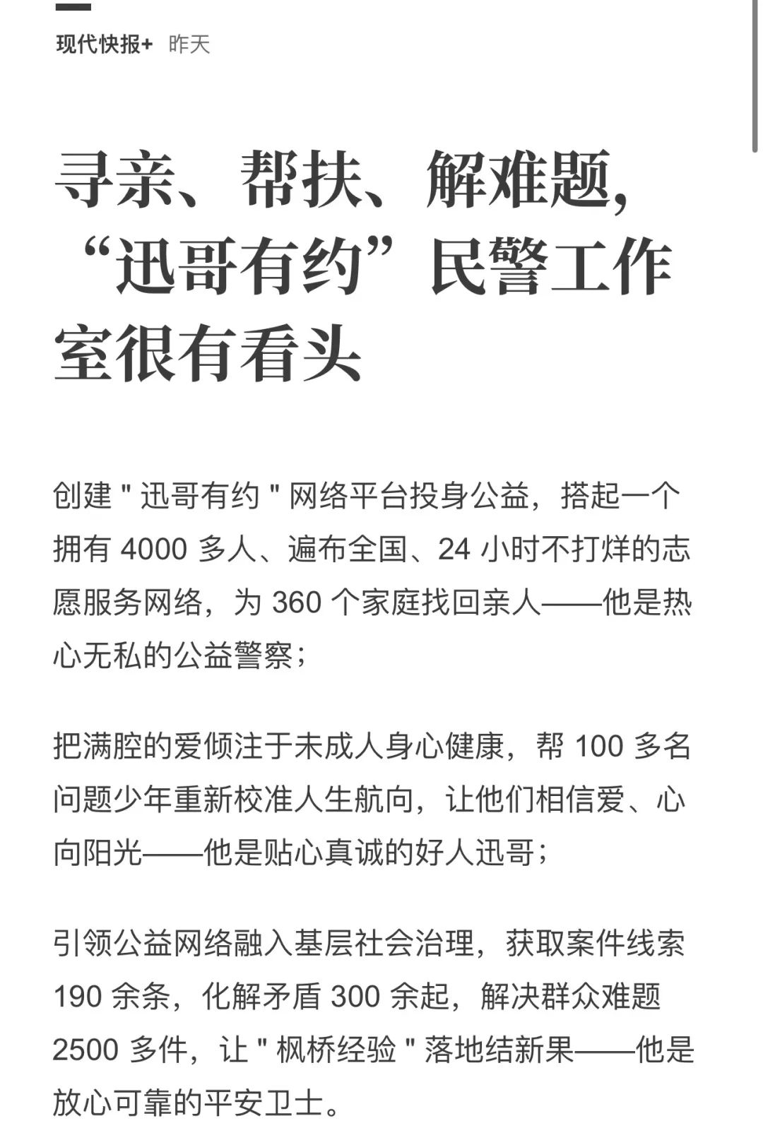 創建“迅哥有約”網絡平臺投身公益,搭起一個擁有4000多人、遍布全國、24小時不打烊的志愿服務網絡,為360個家庭找回親人——他是熱心無私的公益警察;