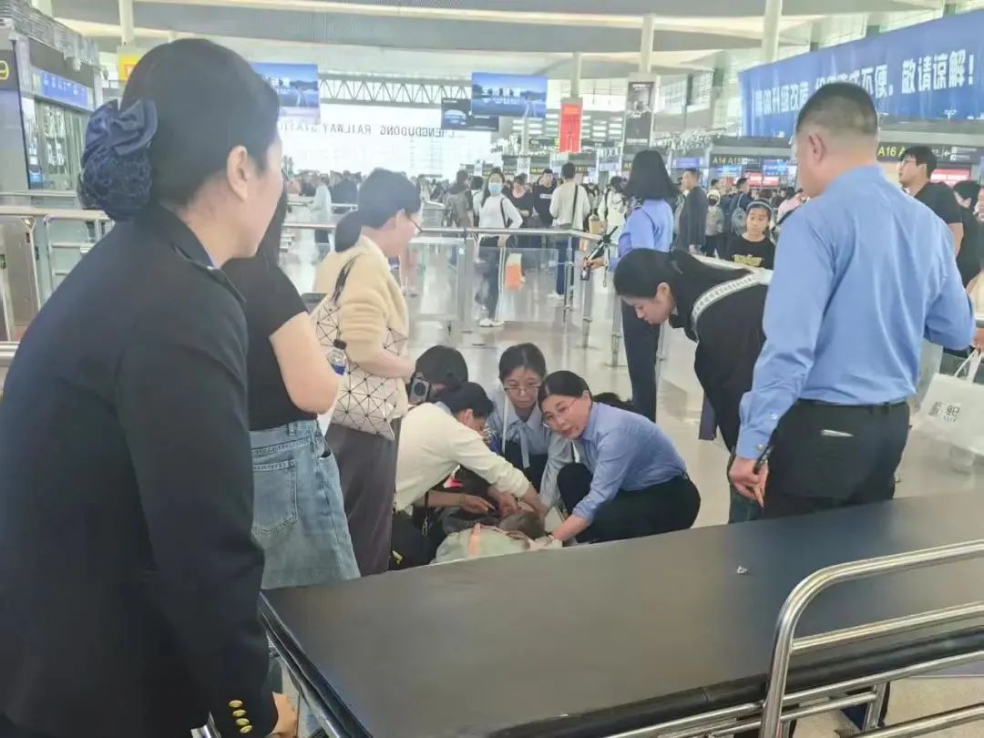 日前,成都東站候車大廳,一名老者突然失去意識、暈厥倒地,家屬萬分焦急,車站工作人員通過廣播緊急尋找醫(yī)務人員。正在外出考察學習途中的江蘇省新康監(jiān)獄民警們聽到廣播后,第一時間趕往現(xiàn)場施救。