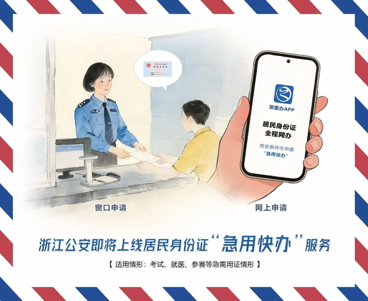 11月28日,記者從省公安廳居民身份證制作中心獲悉,自12月1日起,居民身份證“急用快辦”服務(wù)將在“浙里辦”APP正式上線。該服務(wù)著力破解群眾在考試、參賽、省外就醫(yī)等特殊情況下的用證燃眉之急,申請(qǐng)后3至5個(gè)工作日即可領(lǐng)證,切實(shí)便民利民。