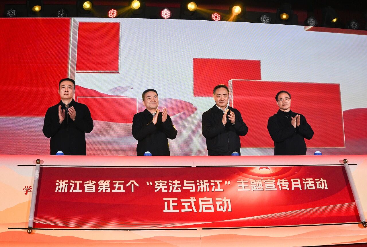 12月4日,在第十二個國家憲法日到來之際,浙江省第五個“憲法與浙江”主題宣傳月活動啟動儀式在杭州舉行。此次宣傳月主題是“學習宣傳貫徹習近平法治思想,推動憲法深入人心”。省委常委、政法委書記王成國,省人大常委會黨組成員、副主任趙光君,省人民政府副省長、省公安廳廳長楊青玖,省政協黨組副書記、副主席王昌榮出席并啟動主題宣傳月活動。