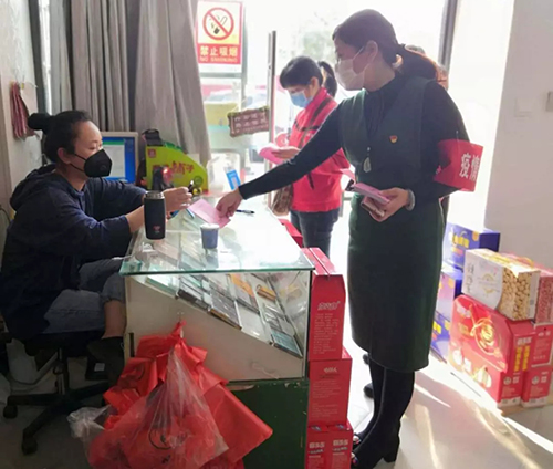 董艷(右一)為商戶發(fā)放疫情防控宣傳材料