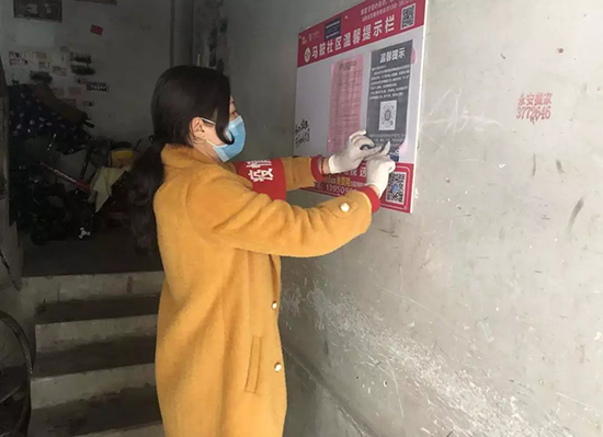 董艷(左一)跟同事討論居家隔離溫馨提示張貼事宜
