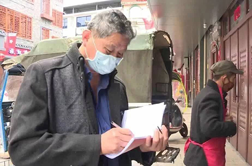 這位上門排查的工作人員叫謝錦輝,是土生土長的洋口鎮(zhèn)人。疫情發(fā)生后,他被選為洋口街道居委會第二片區(qū)的“片長”兼“鄰長”。每天早上8點,他準時出門,開始在片區(qū)內(nèi)走訪排查。