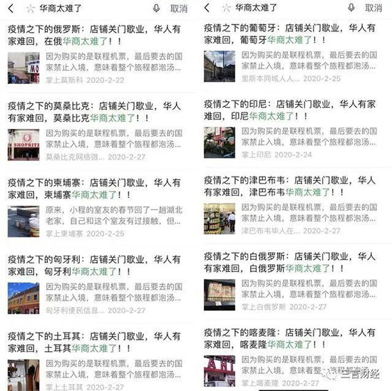 “疫情之下的XXX:店鋪關(guān)門歇業(yè),XXX華商太難了!”、“留在XXX的華人華僑:思來想去還是暫時(shí)不回國(guó)好!”……2月27日至3月16日,“掌上土耳其”“掌上南非”“厄瓜多爾華人在線”等60多個(gè)微信公眾號(hào)發(fā)布多篇雷同文章,從而引發(fā)社會(huì)的關(guān)注。