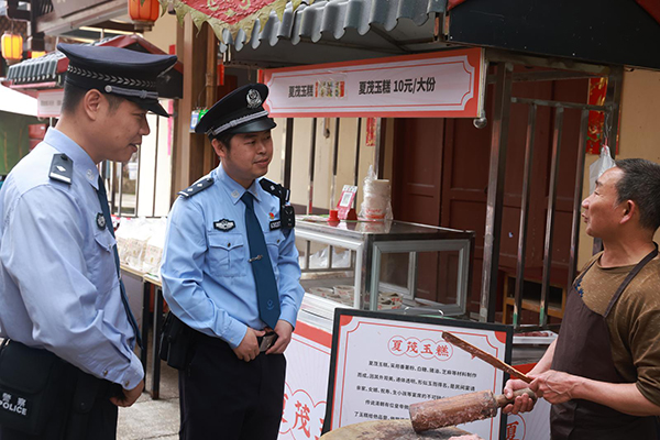 夏茂派出所民警在俞邦村尋根追味小吃街與小吃業主交流,宣傳安全知識