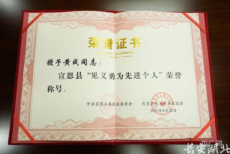 黃成被授予“見義勇為先進個人”榮譽稱號(宣恩縣委宣傳部供圖)