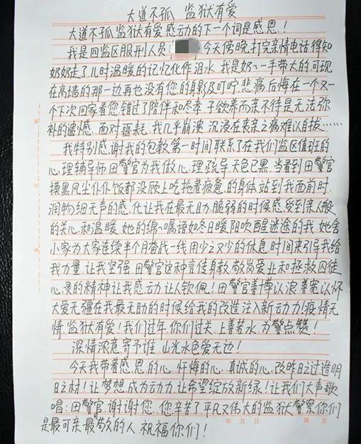 事后,申某寫下感恩文字《大道不孤,監獄有愛》:“疫情無情,監獄有愛!我們過年,你們過關!上善若水,為警點贊!”