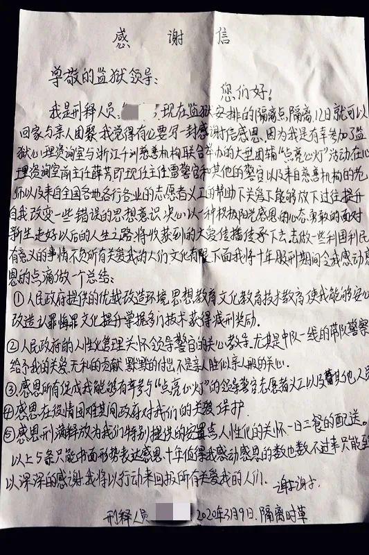 “我有幸參加了監獄心理咨詢室大型團輔‘點亮心燈’活動,在老師和志愿者幫助下能夠放下過往,提升自我,改變錯誤的思想……感謝警官們的教導,感恩疫情困難期間對我們的關愛保護……我將以行動來回報所有關愛我的人們。”近日,湖南省女子監獄收到刑釋人員熊某的“感謝信”——回憶了她十年刑期里的點滴收獲,表達對監獄、對警官的誠摯謝意。