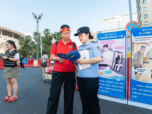 將全民反詐“搬”至球迷身邊。(10月10日,長沙公安在賽場出入口顯眼位置設置了專門的反詐宣傳展臺,為球迷講解最新詐騙手法和防范要點。)