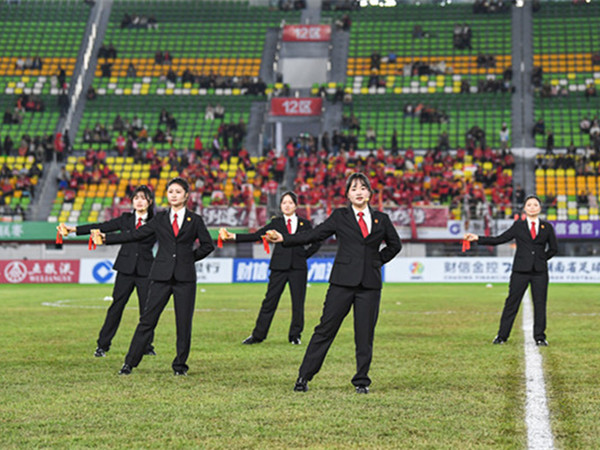 快板表演開辟普法新陣地。(11月2日晚,在湘超聯賽張家界主場對陣衡陽的賽前環節,湖南省張家界市桑植縣人民法院的法官們以原創快板《法官姐姐說普法》開場,將法治教育融入體育賽事的火熱氛圍中。)