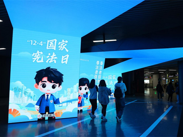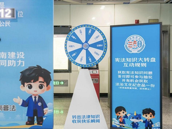 值得關注的是,長沙地鐵數字藝術館打造了主題宣傳空間,以“司法藍”為主色調,運用LED大屏和AI等前沿技術,將“如法少年”動態形象與“湖南普法”新logo動畫相結合,通過沉浸式場景營造,讓群眾在直觀感受品牌魅力的同時,深度領悟憲法精神,成為此次宣傳周的一大亮點。