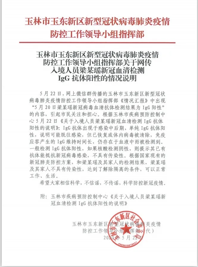 近日,有微信群傳播“玉林市入境人員梁某瑤新冠病毒血清抗體檢測結果為IgG陽性”。