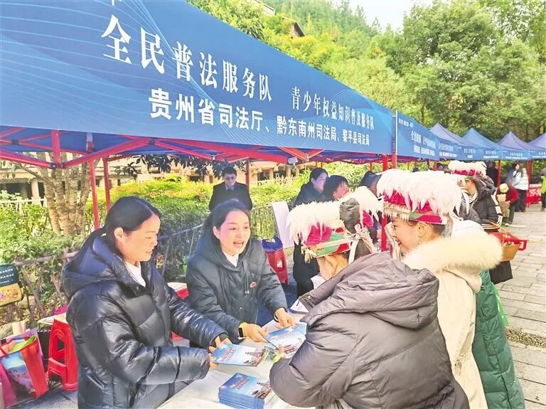 2025年全國(guó)文化科技衛(wèi)生“三下鄉(xiāng)”貴州分會(huì)場(chǎng)集中示范活動(dòng)在黔東南州黎平縣肇興村舉行,司法行政機(jī)關(guān)工作人員在活動(dòng)現(xiàn)場(chǎng)為群眾提供普法和法律咨詢服務(wù)。
