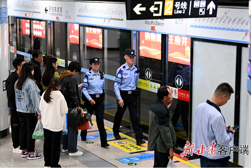 蘭州市公安局交通治安分局雁園路軌道治安派出所警力在五里鋪地鐵站巡邏,護(hù)航市民群眾平安出行。新甘肅·甘肅日報(bào)通訊員 張軍揚(yáng) 攝