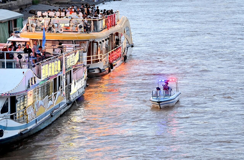 “報告中心,水上派出所正在開展無人機與水面船艇立體巡邏,一切正常?!蹦荷碌奶m州黃河水車博覽園段,蘭州公安巡邏艇的警燈劃破夜幕,無人機正在河岸樹叢中巡查……