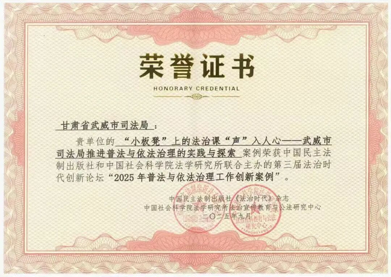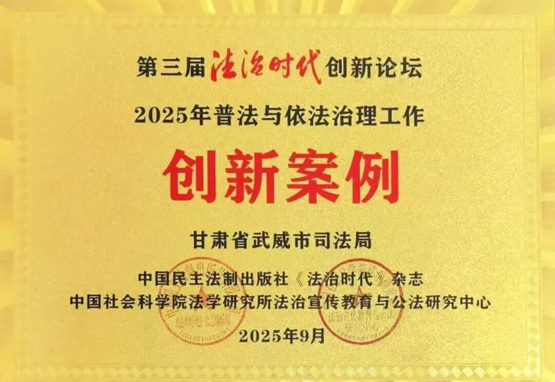近日,在中國民主法制出版社和中國社會科學院法學研究所聯合主辦的第三屆法治時代創新論壇上,武威市《“小板凳”上的法治課“聲”入人心——武威市司法局推進普法與依法治理的實踐與探索》獲評“2025年普法與依法治理工作創新案例”,該案例同時入選第四批全省普法與依法治理創新案例。