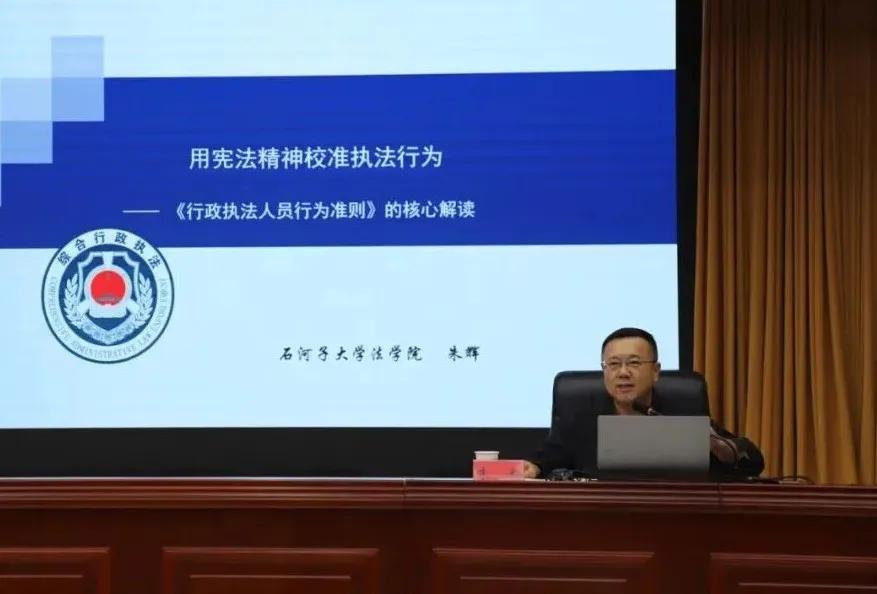 12月2日,第七師胡楊河市舉辦“憲法進機關”專題活動,特邀石河子大學法學院教授朱輝作專題講座。朱輝以“用憲法精神校準執法行為——《行政執法人員行為準則》核心解讀”為題,從設立國家憲法日的意義切入,強調“憲法應鐫刻在每個公民心中”,還結合行政執法實際,對《行政執法人員行為準則》中“十個嚴禁”的內容進行逐條解讀,引導執法人員自覺以憲法為遵循,規范執法行為、堅守法律底線。