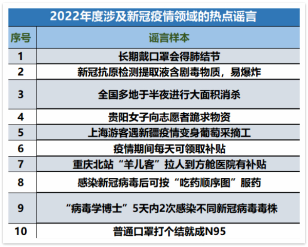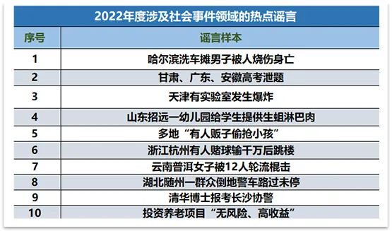 2022年,國(guó)際國(guó)內(nèi)熱點(diǎn)事件中,網(wǎng)絡(luò)謠言“趁虛而入”,時(shí)有發(fā)酵,涉及疫情防控、公共政策、社會(huì)事件、醫(yī)療健康、自然現(xiàn)象等公眾關(guān)心關(guān)切領(lǐng)域,可謂“套路百出”,令人深惡痛絕。針對(duì)網(wǎng)絡(luò)謠言這一痼疾,中國(guó)互聯(lián)網(wǎng)聯(lián)合辟謠平臺(tái)重拳出擊,全年共受理網(wǎng)民謠言舉報(bào)信息3萬(wàn)余條,匯集謠言樣本和辟謠數(shù)據(jù)2.45萬(wàn)條,共發(fā)布各類辟謠稿件1.31萬(wàn)篇,推出了12期《打擊網(wǎng)絡(luò)謠言 共建清朗家園 中國(guó)互聯(lián)網(wǎng)聯(lián)合辟謠平臺(tái)月度辟謠榜》、科學(xué)流言榜以及“涉防災(zāi)減災(zāi)辟謠榜”“涉化妝品辟謠榜”“涉高考高招辟謠榜”“涉食品安全辟謠榜”等行業(yè)辟謠榜單。這些謠言背后的真相您都了解了嗎?中國(guó)互聯(lián)網(wǎng)聯(lián)合辟謠平臺(tái)特此盤點(diǎn)解析,為您澄清謬誤,傳遞事實(shí)真相。