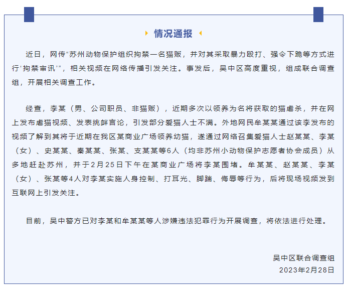 經(jīng)查,李某(男、公司職員、非貓販),近期多次以領(lǐng)養(yǎng)為名將獲取的貓虐殺,并在網(wǎng)上發(fā)布虐貓視頻、發(fā)表挑釁言論,引發(fā)部分愛貓人士不滿。外地網(wǎng)民牟某某通過該李發(fā)布的視頻了解到其將于近期在我區(qū)某商業(yè)廣場(chǎng)領(lǐng)養(yǎng)幼貓,遂通過網(wǎng)絡(luò)召集愛貓人士趙某某、李某(女)、史某某、秦某某、張某、支某某等6人(均非蘇州小動(dòng)物保護(hù)志愿者協(xié)會(huì)成員)從多地趕赴蘇州,并于2月25日下午在某商業(yè)廣場(chǎng)將李某圍堵。牟某某、趙某某、李某(女)、張某等4人對(duì)李某實(shí)施人身控制、打耳光、腳踹、侮辱等行為,后將現(xiàn)場(chǎng)視頻發(fā)到互聯(lián)網(wǎng)上引發(fā)關(guān)注。